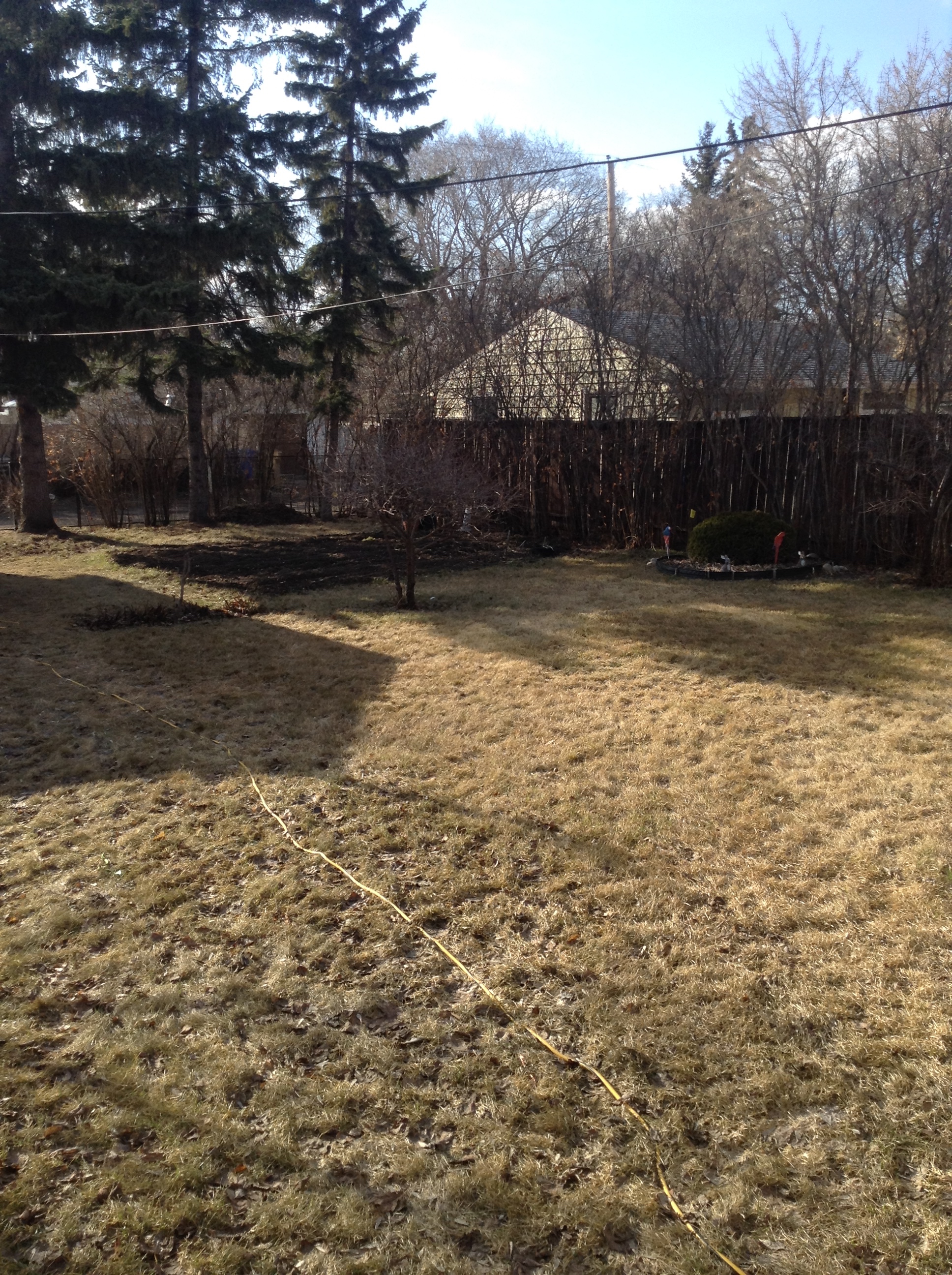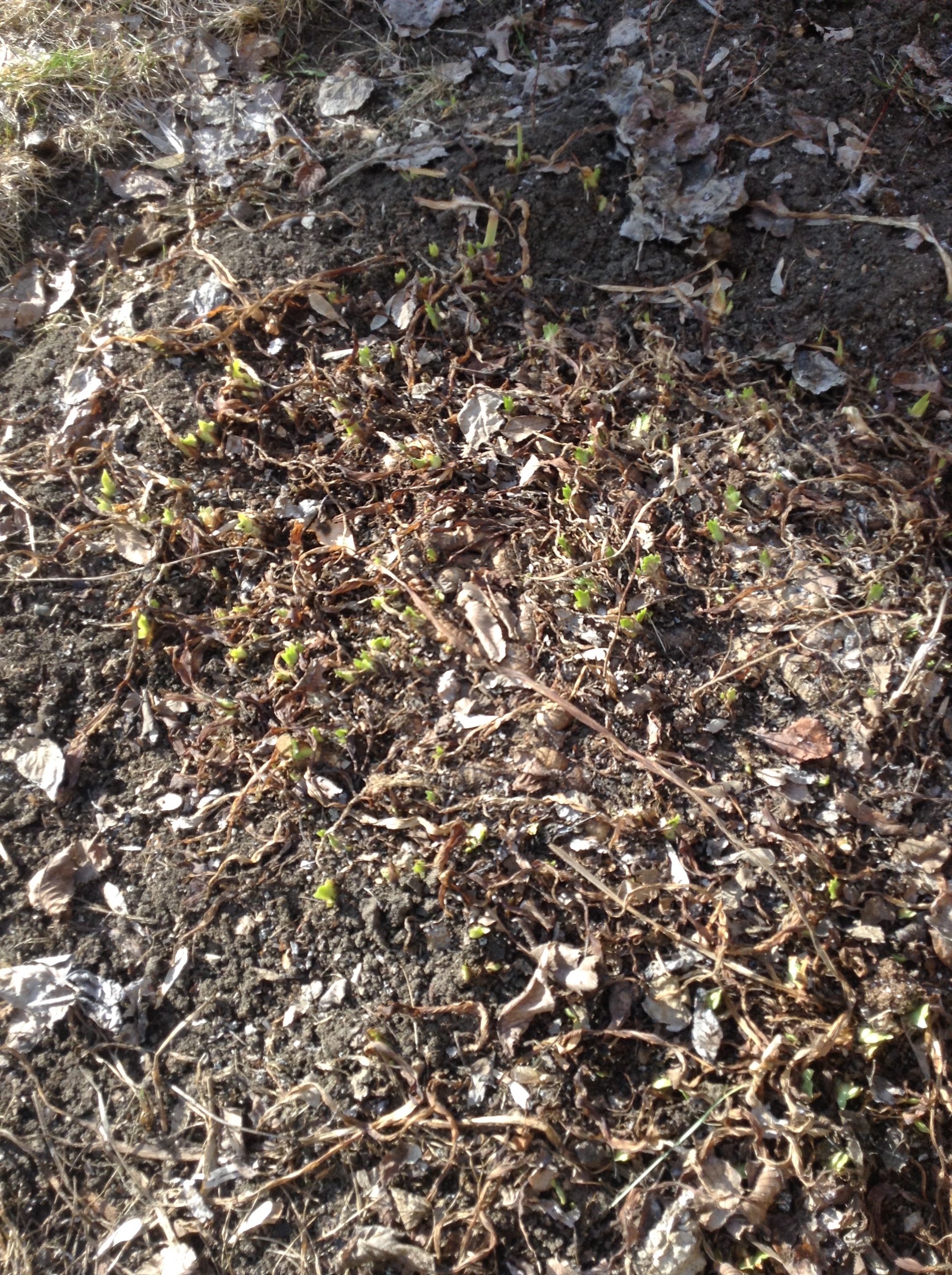 Ok it’s tough to see. But those little green dots scattered all through the mountain of dirt, leaves, and other debris are the sprouts of the irises that will be blooming for me this year. Even more exciting was the realization that the circular bed with the huge mound cedar in it is also filled with dead leaves….not just any dead leaves, but dead leaves that look like there are at least 60-70 bulbs attached to them. I didn’t touch this bed. I left it exactly as I found it, unable to see anything sprouting as of yet. No doubt in the next few days something is going to poke itself out of the ground as the daytime temperatures are going to climb into the mid-high teens…celsius.
