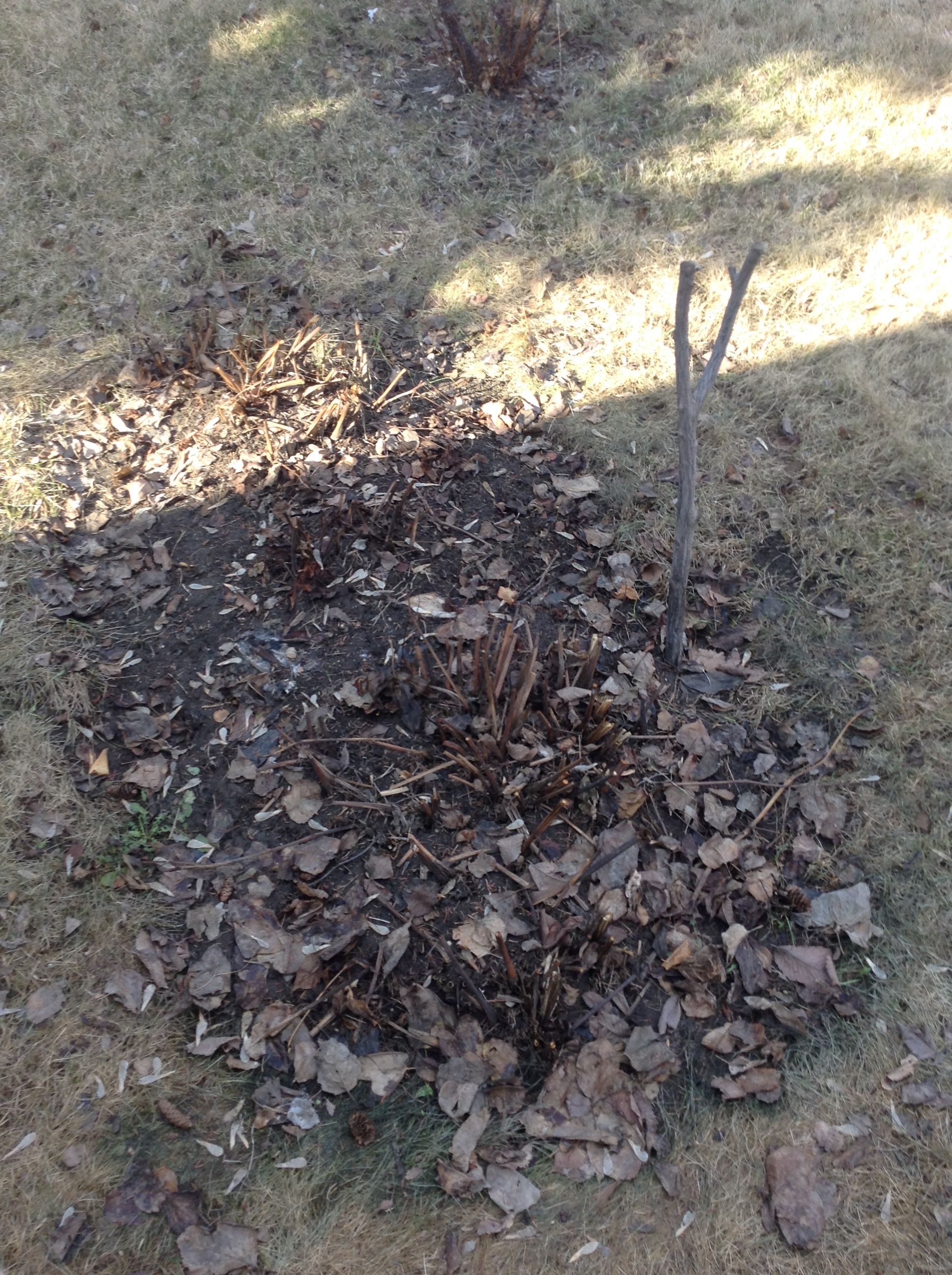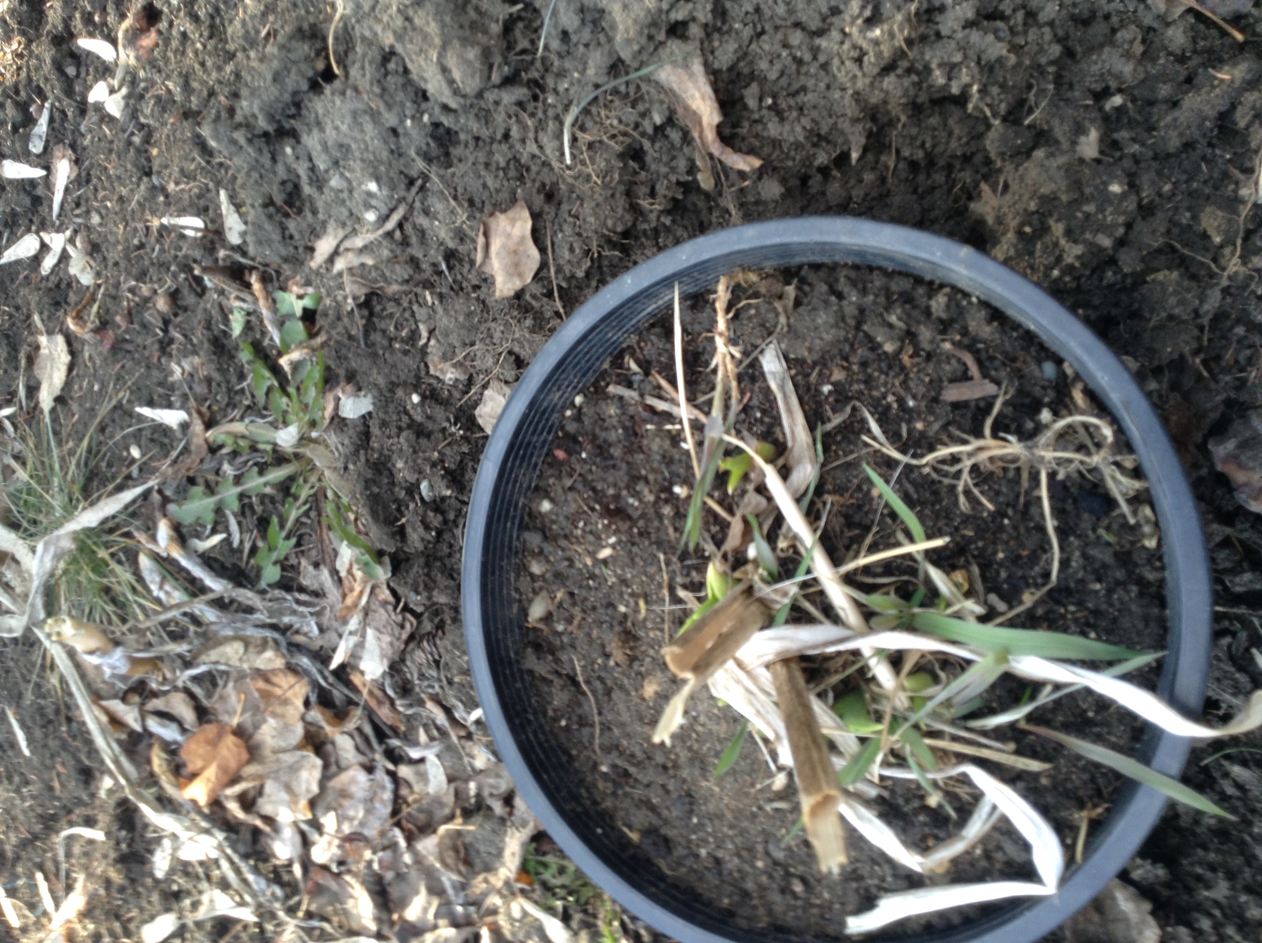 Yup I know, it looks like a pile of leaves. I trimmed back quite a bit of wet and deteriorating leaves and pulled away the bits of rope and wood that were holding the flowers up. You can see one stick still in the ground, that I left in the ground, because you can never know when your’e going to need a long, forked, rough stick. I snipped the leaves down into smaller pieces and spread them on the ground: the bottom layer of the compost pile. Next, I went around to the other bed, and started pulling out dead marigolds, banging off the dirt and breaking them up slightly so I can layer wet, then dry, then wet. That’s when I came across the surprises. The perennials that already exist, and are starting to poke themselves out of the ground. A mound of iris that is about three feet by there feet, so old that the centre of the mound has gone punky.