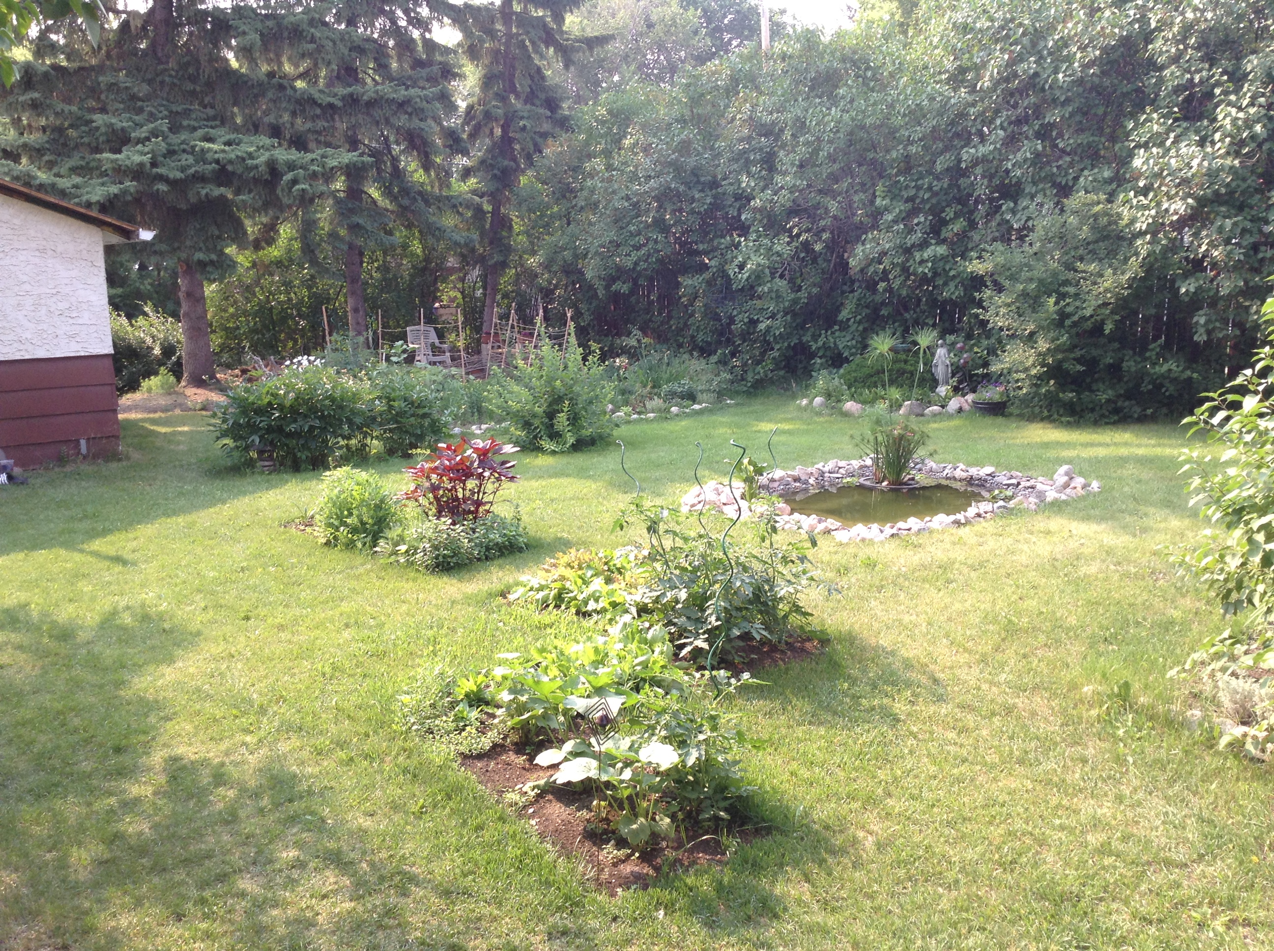 So Dad had an old cast-iron Chinese lantern that’s been around for at least as long as I have (so that’s at least 44 years old if not older….holy crap)…to punch it up beside the pond, I spray painted it with a rust-protecting paint bright red. Cherokee red would’ve been preferred (just because of that damn Frank Lloyd Wright addiction I can’t seem to shake), but the red wagon colour is about as close, if not exact, as I can get. And I’m loving how the red amaranth (Hopi) is contrasting against the other perennials. The pond is going slightly green because of algae, but the addition of some more plants, and the continued grown of the water hyacinth will help to provide more shade and reduce that issue. There is a resident in the pond along side the multitude of water beetle that just appeared almost overnight. I got a rainbow gourami (yes, a tropical fish!) and put him in there. They’re members of the labyrinth fish family, surfacing to take a gulp of air every so often, so as a tropical fish they’re well suited to stagnant ponds. There’s not water circulation as of yet, but I may get a small pump and put it in to help deal with the algae. Then again, I might end up with $150 worth of water lilies and some snails…..