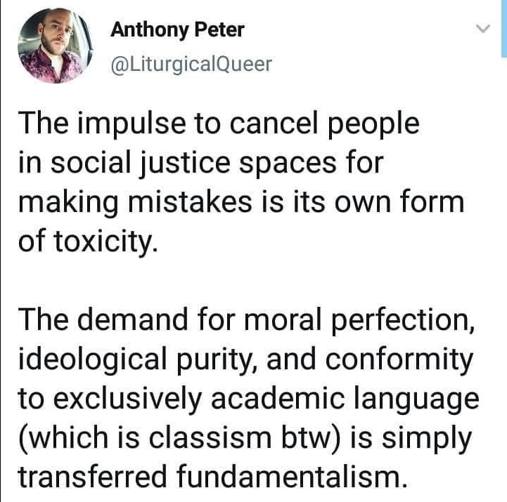 The demand for moral perfection, ideological purity, and conformity to exclusively academic language (which is classism btw) is simply transferred fundamentalism.