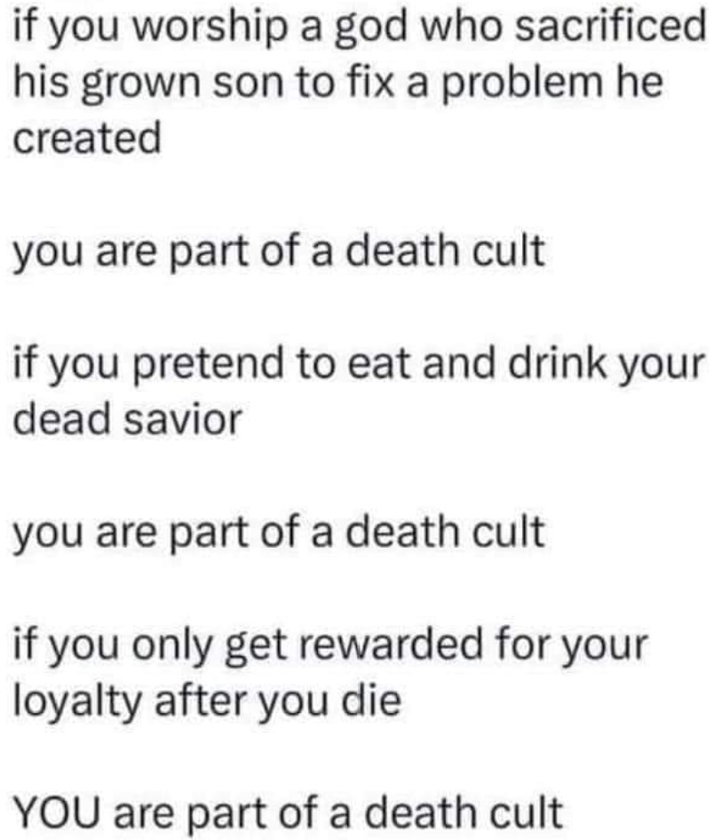 The first reaction I had when I saw this was omfg punctuation? The second reaction was to try and argue that my faith was not a death cult at all, but to attempt to explain how in fact it was anything but a death cult. My third reaction was: why, on the fourth day of my honeymoon in Japan, am I still thinking about this?